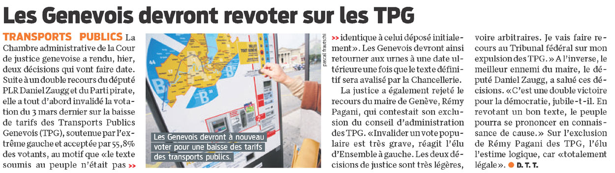 Par un arrêté rendu ce jour, la Chambre administrative de la Cour de justice a statué sur le recours conjoint que j’ai lancé avec le Parti Pirate: le scrutin du 3 mars 2013 sur la hausse des tarifs TPG (IN 146) a été invalidé.